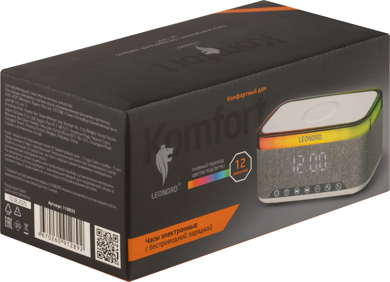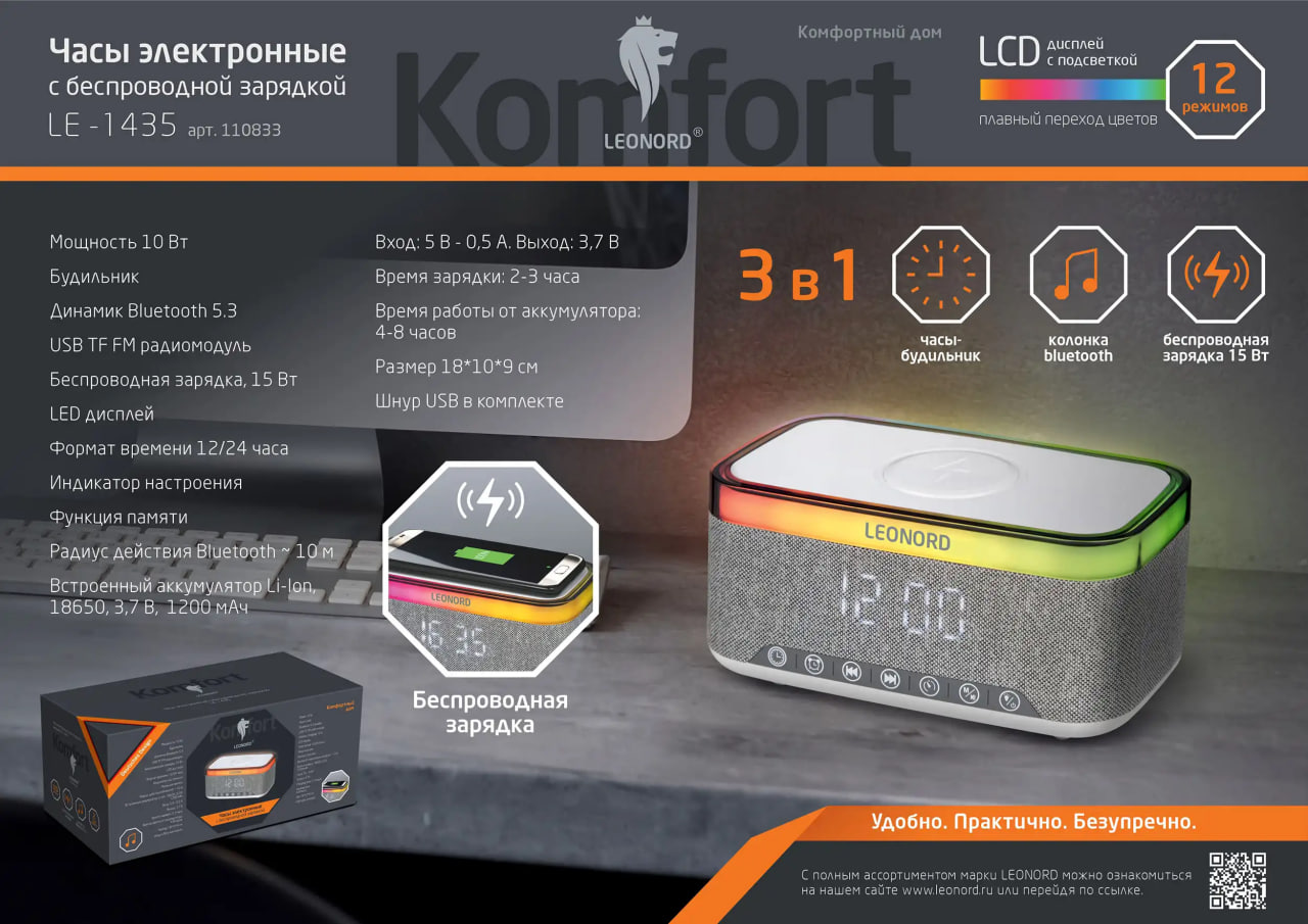 Представляем электронные часы Leonord с беспроводной зарядкой, которые станут незаменимым помощником в вашем доме или офисе. Эта компактная беспроводная колонка сочетает в себе современные технологии и удобные функции, позволяя наслаждаться музыкой, оставаться в курсе новостей и контролировать время.