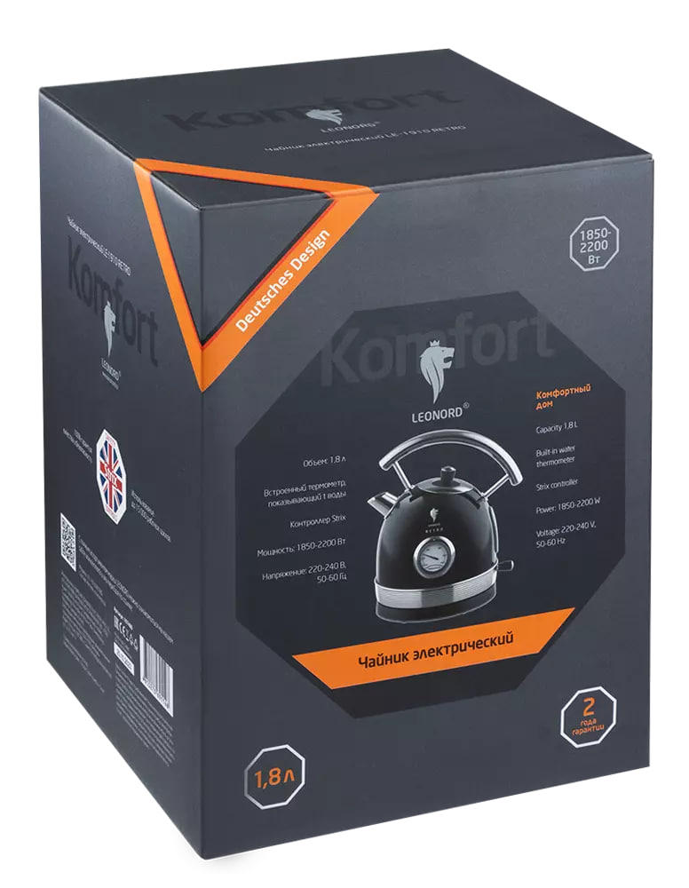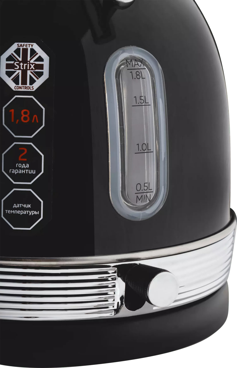 Объем этого чайника составляет 1,8 литра, что идеально подходит для семьи или для комфортного чаепития с гостями. Мощность 2200 Вт обеспечивает быстрое закипание воды, снижая время ожидания и позволяя наслаждаться горячими напитками в кратчайшие сроки. Встроенный термометр на корпусе дает возможность точно контролировать температуру воды, что особенно важно при приготовлении различных видов чая, кофе или других напитков, требующих определенной температуры.