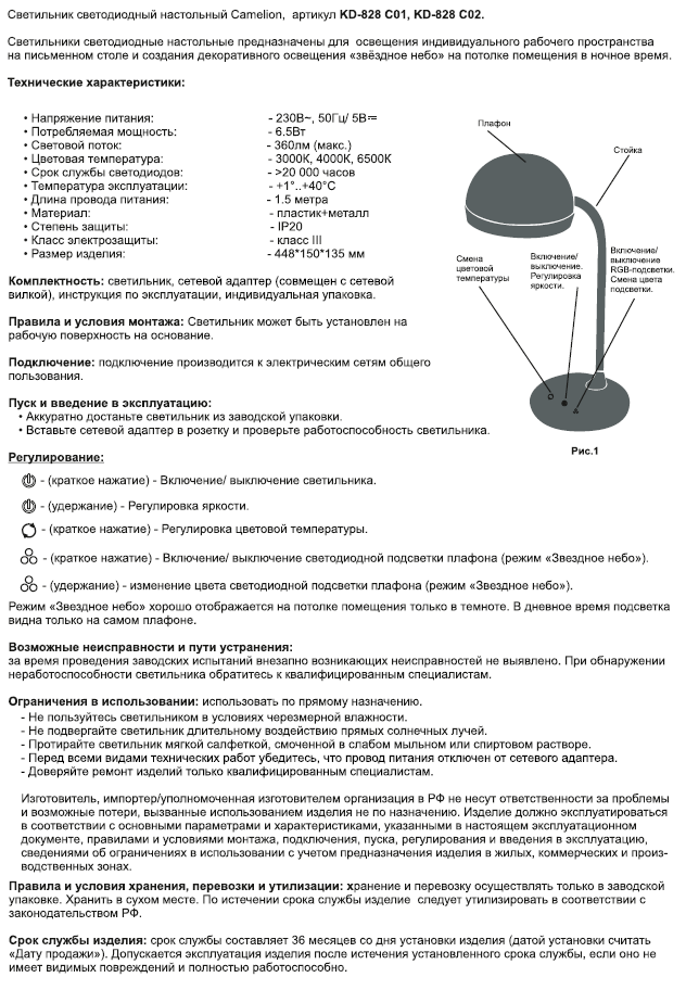 Настольный светодиодный светильник Camelion KD-828 сочетает в себе функциональность рабочего освещения и эффектный RGB-проектор звездного неба. Он подходит для использования в офисах, домашних интерьерах, а также в детских и подростковых комнатах. Встроенные светодиоды мощностью 6,5 Вт обеспечивают максимальный световой поток до 360 лм. Корпус и плафон выполнены из ABS-пластика, а гибкая металлическая стойка в силиконовом покрытии позволяет легко регулировать угол наклона кольцевого плафона.