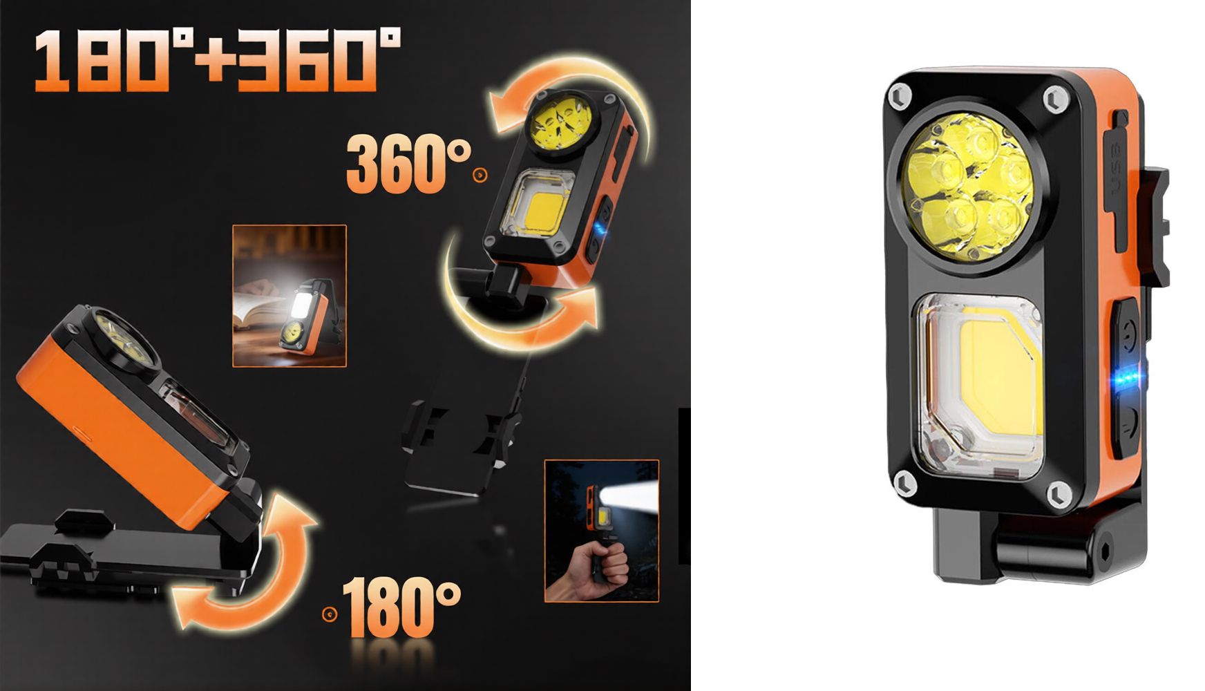 Встроенный магнит: Снимите фонарь с крепления и закрепите его на любой металлической поверхности (капот машины, щиток, труба). Он превращается в удобный стационарный светильник.