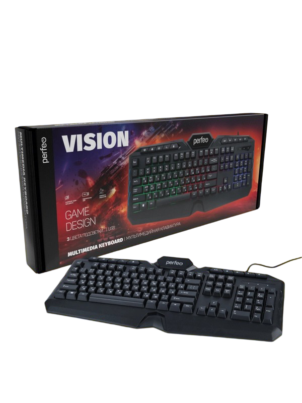 Клавиатура («VISION» GAME DESIGN) выделяется своим геймерским дизайном благодаря высоким мембранным клавишам и трехцветной LED-подсветке, которая меняется между красным, синим и фиолетовым цветами. Мембранная технология нажатия снижает уровень шума, что делает использование клавиатуры комфортным как во время работы, так и во время игр.