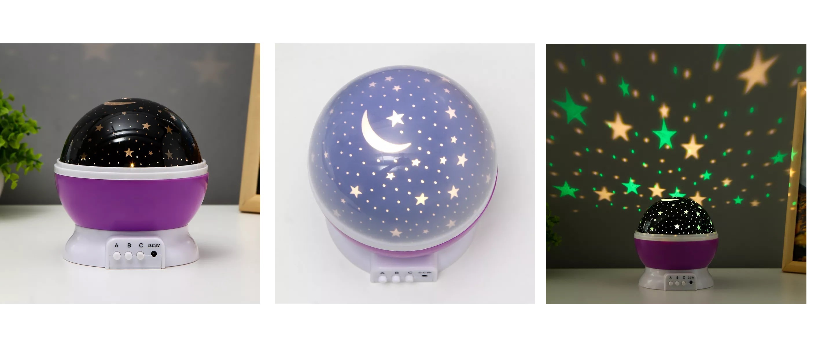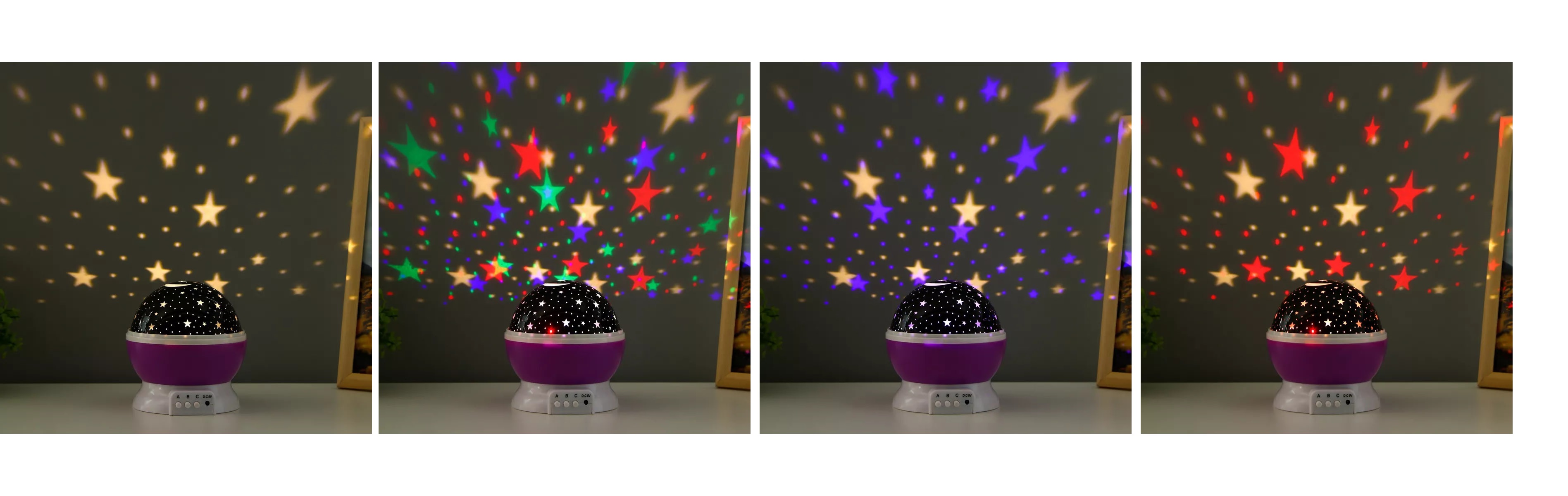 При включении устройство проецирует яркие изображения, наполняющие стены и потолок мерцающими звездами и фантастическими узорами, создавая эффект волшебного ночного неба. Благодаря вращающемуся механизму, изображение плавно движется, добавляя эффект настоящего звездного сияния.