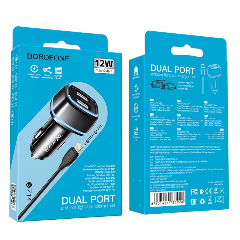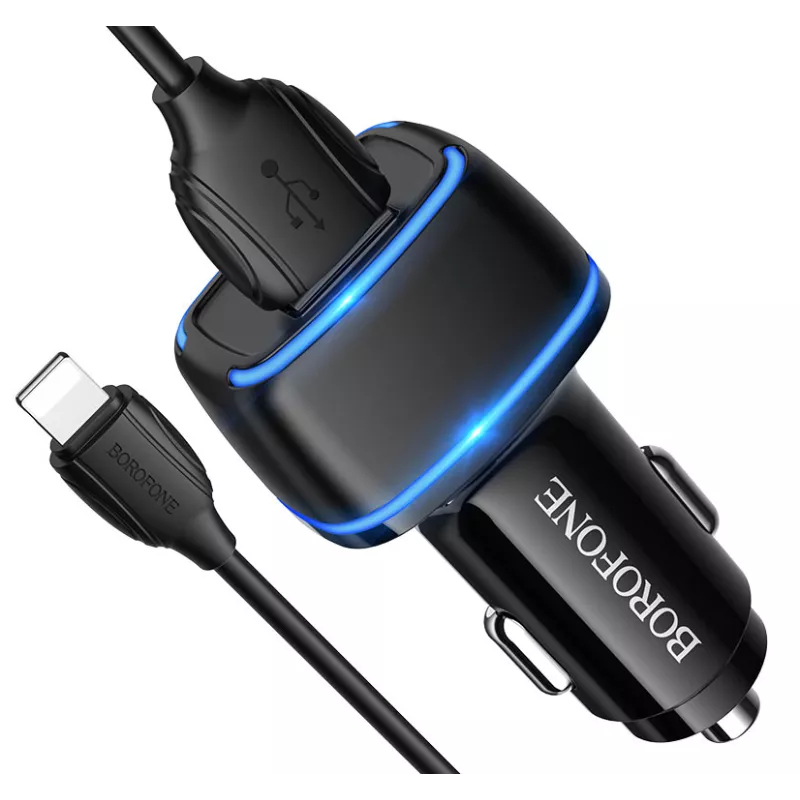 Автомобильное зарядное устройство BOROFONE BZ14 двойной порт черный, с кабелем Lightning 110 1/44/17