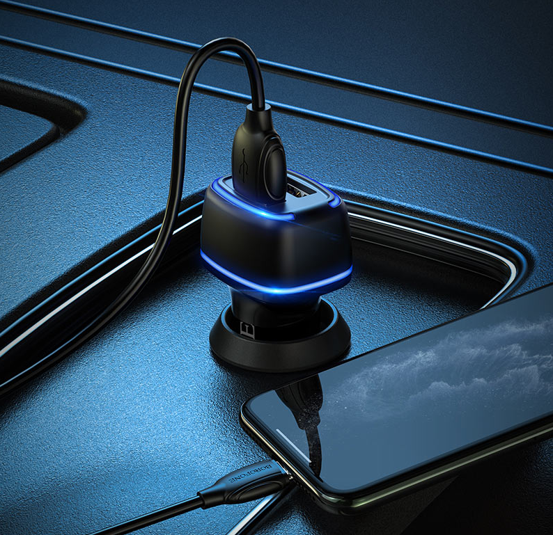 BOROFONE BZ14 Max автомобильное зарядное устройство с двумя USB портами, с подсветкой, набор с кабелем для Lightning, Micro-USB, USB-C.