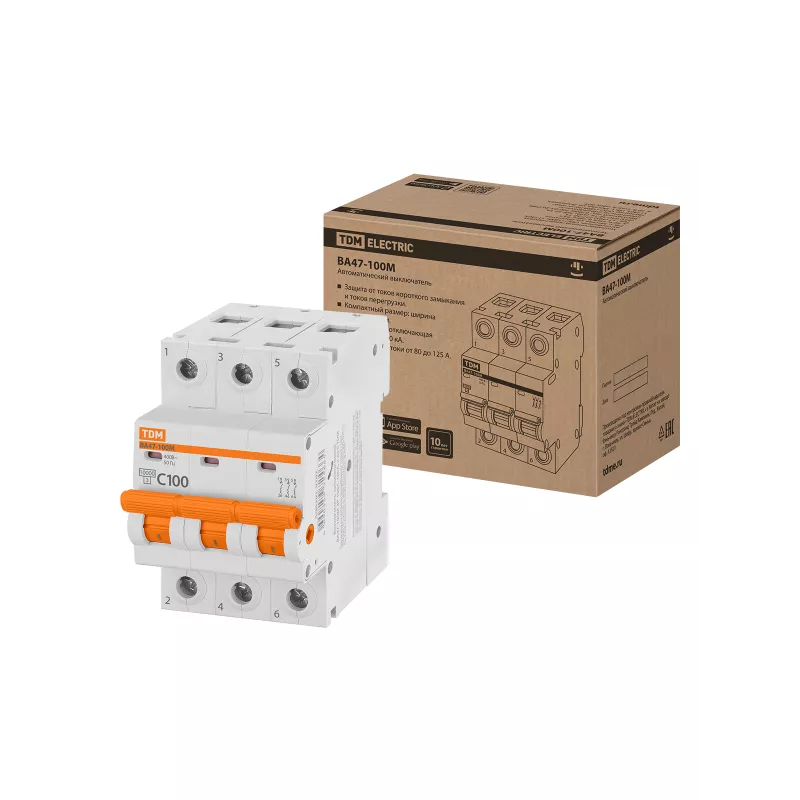 Автоматический выключатель TDM ВА47-100, 3-полюсный, 100 А, сопротивляемость коротким замыканиям 10 кА, характеристика срабатывания "С" — предназначен для защиты электросетей и оборудования от коротких замыканий и перегрузок.