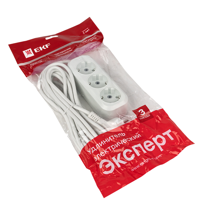 Бытовой удлинитель с тремя гнездами с заземлением предназначен для подключения электрических приборов и устройств различного назначения. Длина кабеля 5 метров. Номинальный ток 16 А.