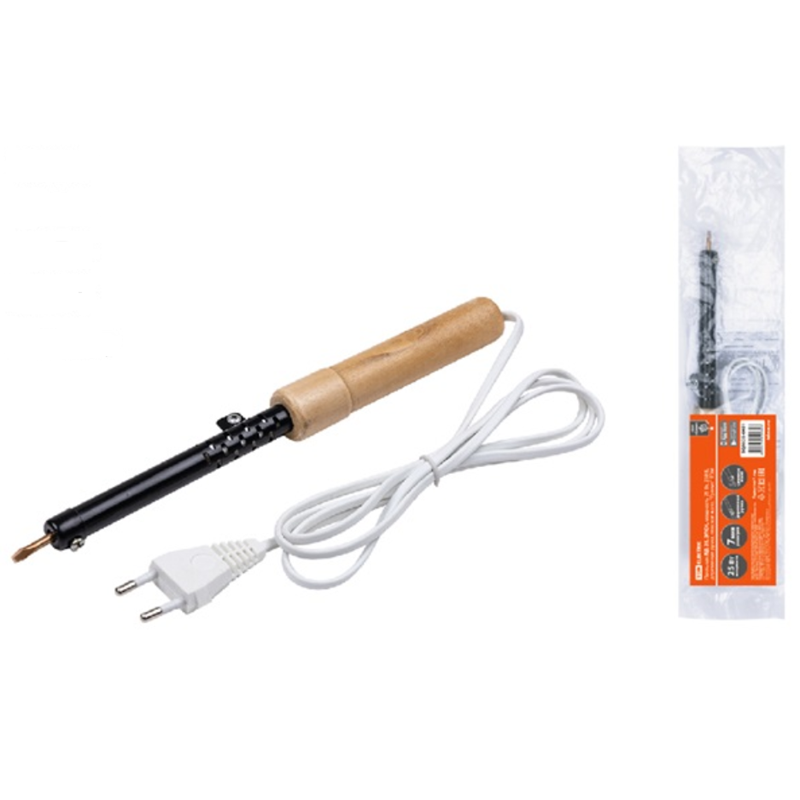 Электропаяльник предназначен для работы с низкотемпературными припоями при нанесении их на спаиваемые поверхности. Паяльник имеет сменное жало, тем самым есть возможность использовать различные типы паяльных стержней для выполнения широкого спектра паяльных работ. Рукоятка изготовлена из дерева, удобно лежит в руке, не выскальзывает и нагревается меньше, чем пластиковая во время продолжительной работы. Преимуществом также является быстрый разогрев до рабочей температуры (от 5 до 7 минут).
