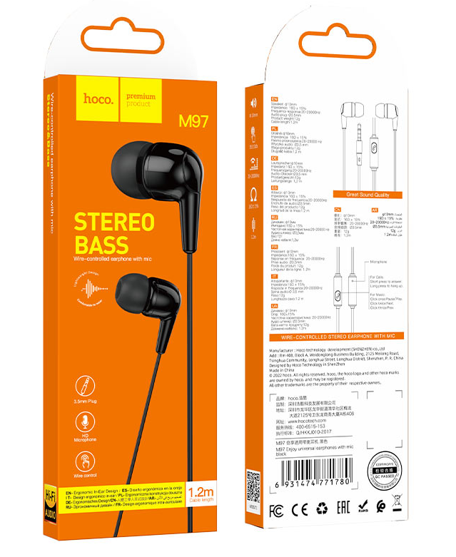 hoco наушники внутриканальные с микрофоном M97 черный 1/420