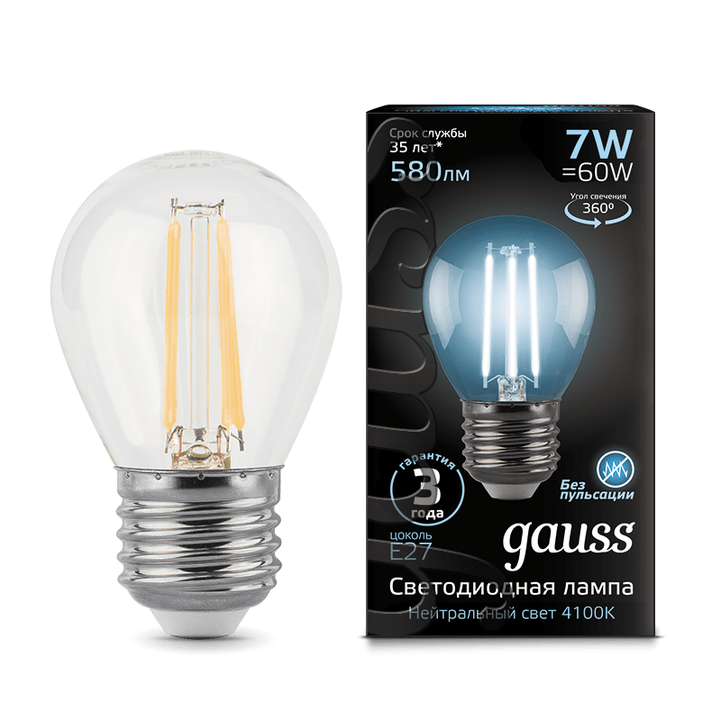 Gauss Лампа светодиодная Filamen F-LED7-G45-4100K-E27 580Lm филаментная 10/50