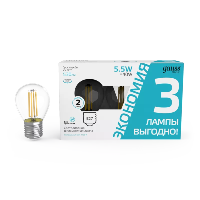 Gauss Лампа светодиодная Basic Filament LED5,5-G45-4100K-Е27 530lm (3 лампы в упак.) 10/20