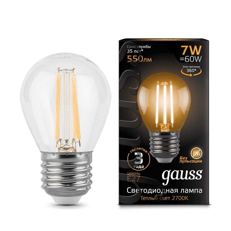 Gauss Лампа светодиодная Filamen F-LED7-G45-2700K-E27 550Lm филаментная 10/50