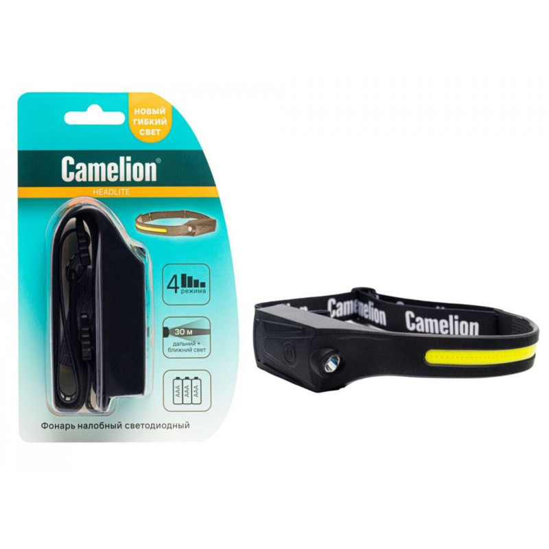 Фонарь Camelion LED5383 фонарь налобн, лента каучук. COB+LED, 4 реж, 3XAAA, черный