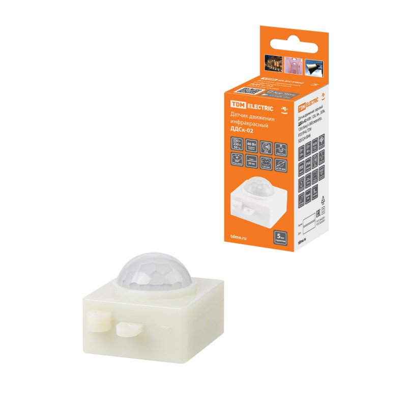 Датчик движения TDM ДДСк-02 (SQ0324-0046) предназначен для автоматического запуска и остановки нагрузки в заданное время при обнаружении движущихся объектов в его зоне и с учетом уровня освещения. Он работает в однофазных электрических сетях с напряжением 230 В и частотой 50 Гц. Корпус датчика изготовлен из пластика, который не поддерживает горение, что повышает его безопасность. Устройство может быть использовано для управления уличным и внутренним освещением, электроприборами, системами сигнализации и многими другими устройствами.
