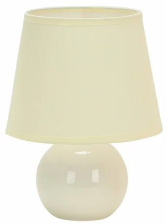 Лампа выполнена с керамическим основанием и тканевым абажуром, с патроном E14, что обеспечивает долговечность и современный стиль.