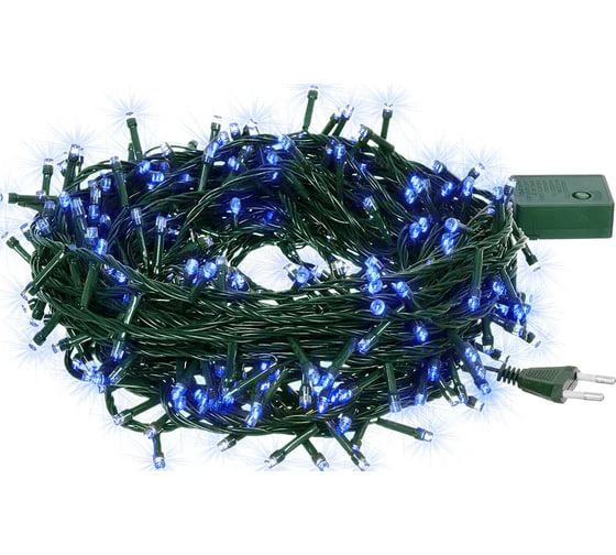 Длина этой гирлянды составляет 10 метров, на которой расположено 100 светодиодов. Свет излучается синим цветом, а провод выполнен в зеленом оттенке. Степень защиты — IP 20, что подходит для использования внутри помещений. Мощность гирлянды — 6 Вт. В комплект входит контроллер с восемью различными режимами работы, позволяющий варьировать световые эффекты.