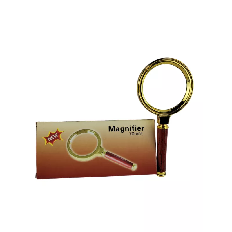 Лупа имеет диаметр 70 мм. Поставляется в пластиковом корпусе золотистого цвета, линза стеклянная. Снабжена коричневой ручкой округлой формы. Оправа линзы выступает за края, предупреждая механические повреждения при движении лупы по поверхности. Позволяет производить семикратное увеличение.